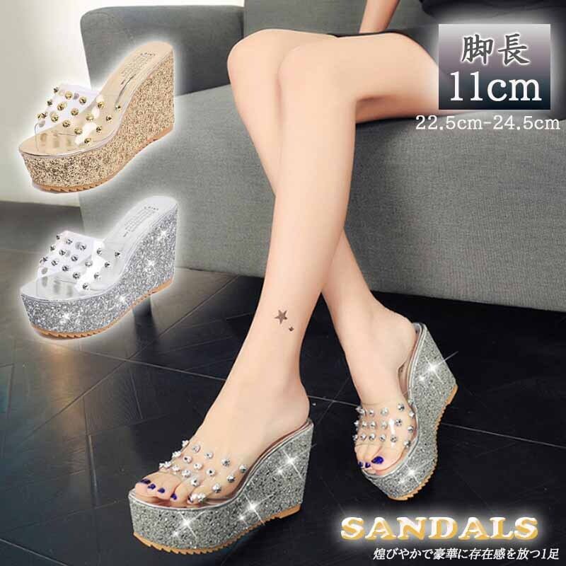 レディース サンダル オープントゥ 11cm スパンコール 美脚 脚長キラキラ ウェッジソール 厚底